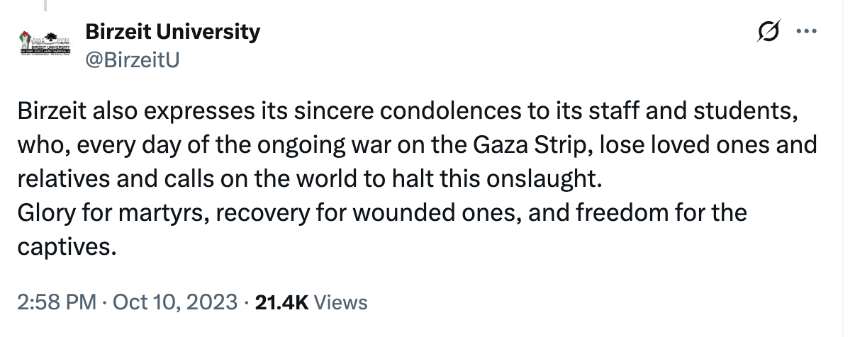 But the school itself, just hours after the October 7th terrorist attack, tweeted “glory for martyrs.”