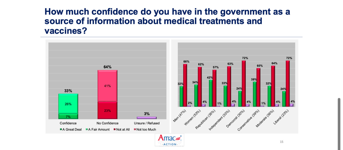 The polling also highlighted that in the wake of the pandemic, seniors remain skeptical of government overreach and involvement in their healthcare decisions. 64 percent said they had little confidence in the government as a source of information on medical treatments and vaccines, and 65 percent preferred to have all information available regarding a drug, rather than just being reliant on their doctor.
