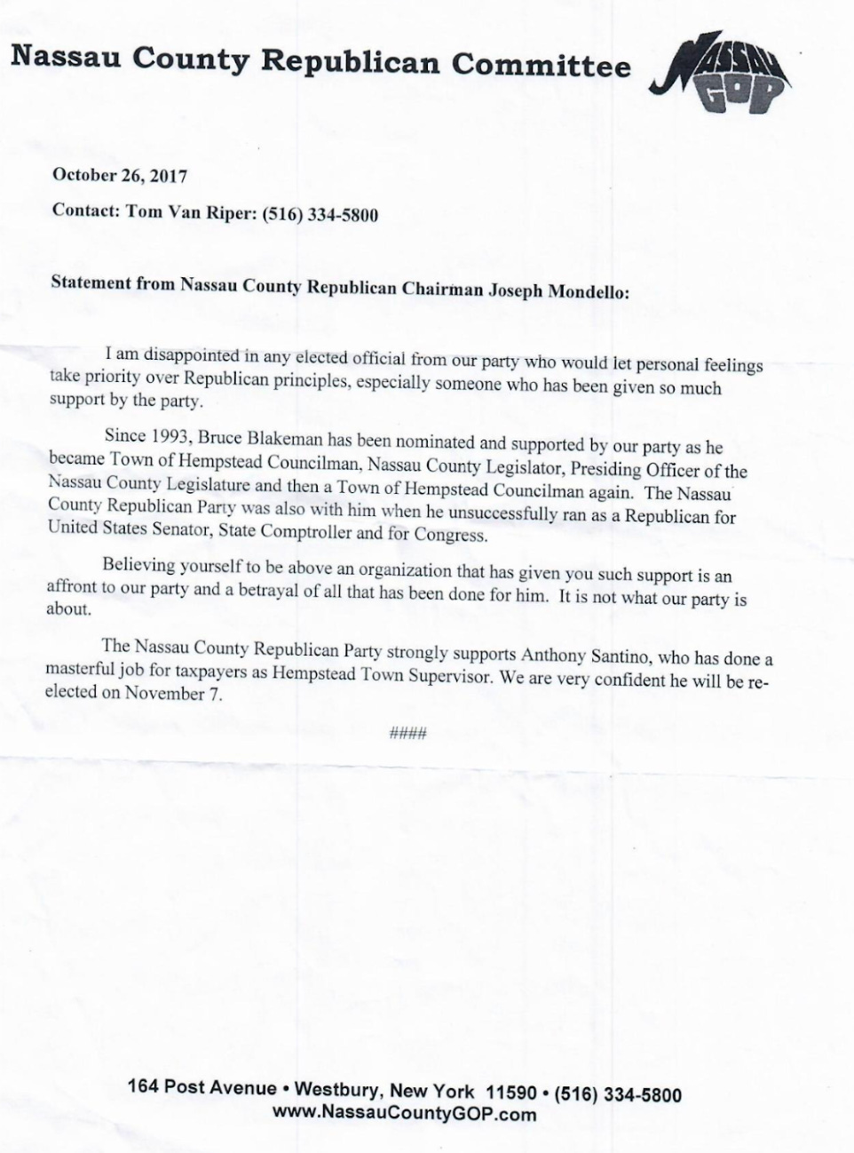 Mondello noted that “since 1993, Bruce Blakeman has been nominated and supported by our party as he became Town of Hempstead Councilman, Nassau County Legislator, Presiding Officer of the Nassau County Legislature and then a Town of Hempstead Councilman again. The Nassau County Republican Party was also with him when he unsuccessfully ran as a Republican for United States Senator, State Comptroller, and for Congress.”