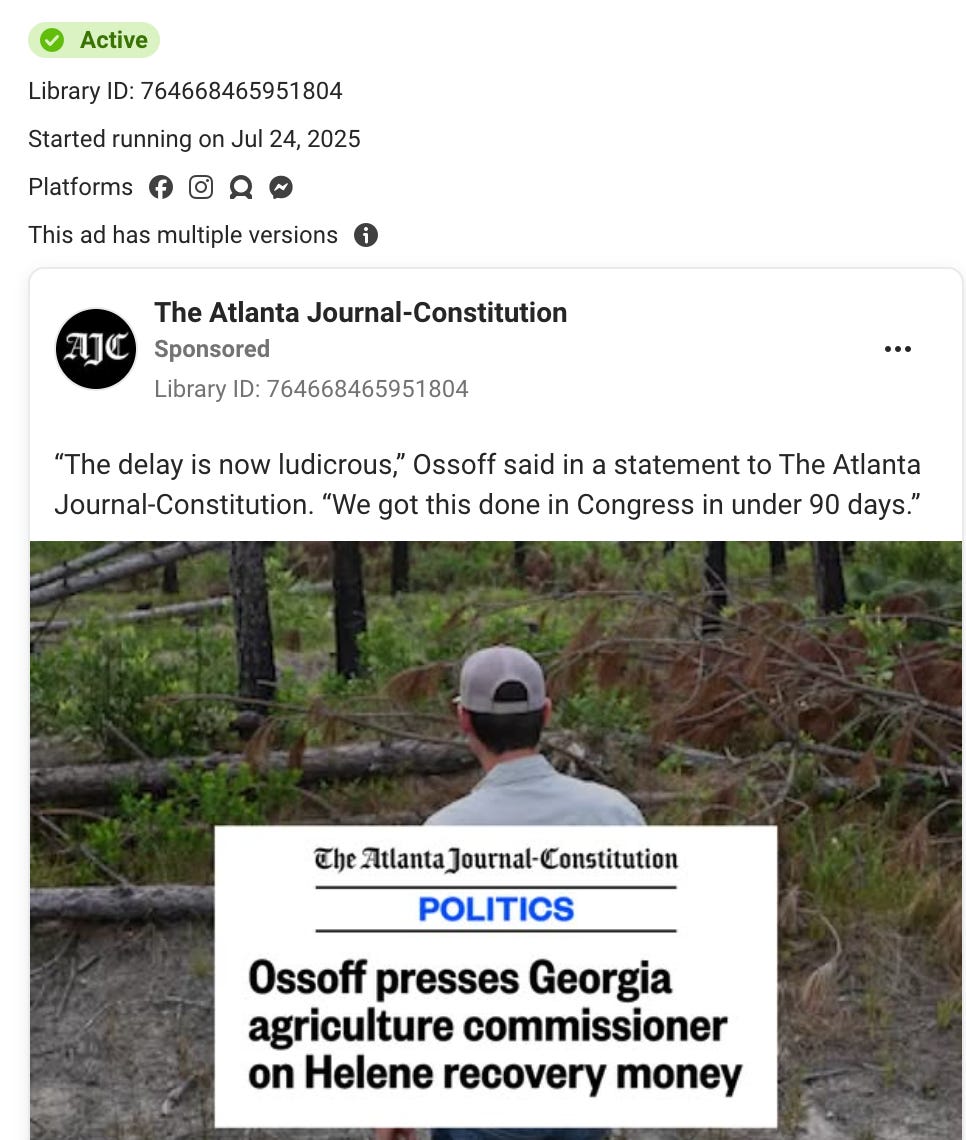 The ad links to an AJC story called “Back from paternity leave, Ossoff takes on Trump administration officials.” The ad has been live for almost a month.