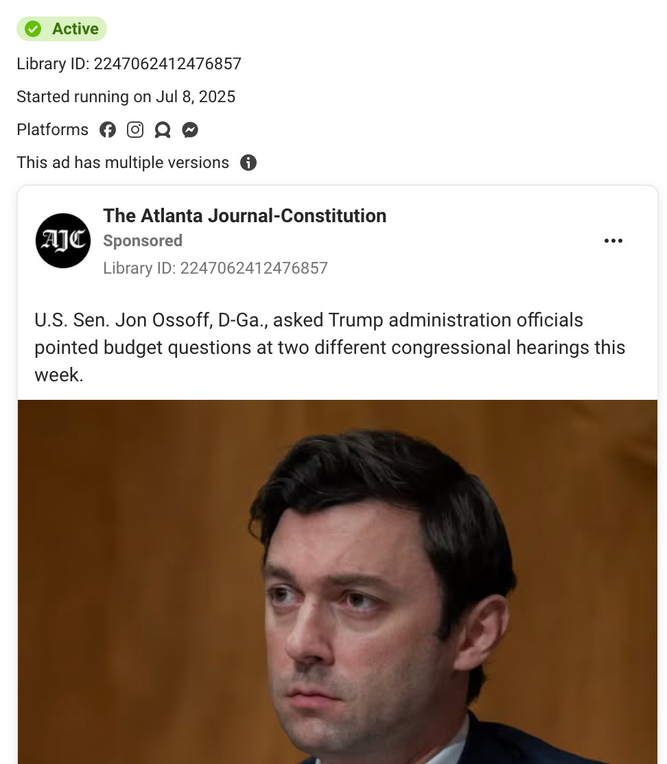 One active AJC ad simply reads, “U.S. Sen. Jon Ossoff, D-Ga., asked Trump administration officials pointed budget questions at two different congressional hearings this week.”