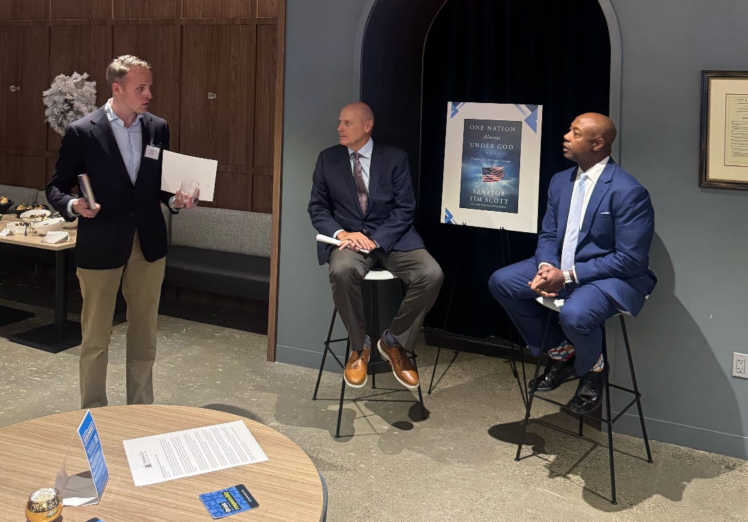Hunt noted to the Reporter after his moderating that his “favorite part was [Scott’s] candor about his grandmother and mother, and his run for president in 2024,” Hunt said. “Chairman Scott has an inspiring story rooted in faith and determination. As a fellow southerner and momma’s boy, I especially loved his comments about his own family and, as a political junkie, would have loved more time to talk to him about his experiences traveling the country as he ran for president. Getting to talk to him about that — as well as a few policy and credit card rewards topics — was an honor.”