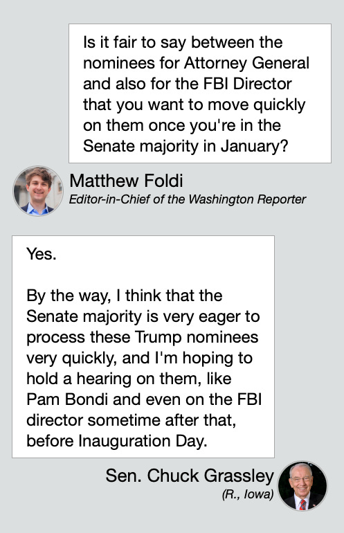 “I think that the Senate majority is very eager to process these Trump nominees very quickly, and I'm hoping to hold a hearing on them, like Pam Bondi, and even on the FBI director sometime after that, before Inauguration Day,” Grassley said. “I don't have any fault with any of them that have been proposed…obviously there's some questions among some of my colleagues and probably by all of the Democrats on two or three of them, and I'm going to let that play out.”