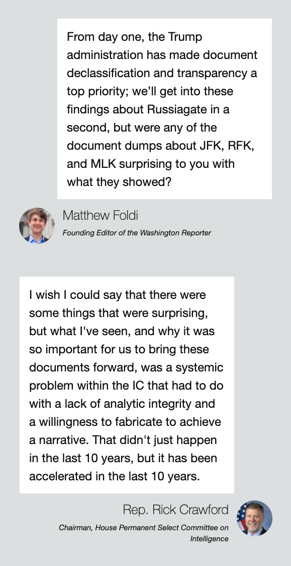 But the Trump administration, following an executive order from President Donald Trump himself, has set about declassifying documents at a breakneck pace, a move that Crawford told the Washington Reporter in an interview is night and day from the previous administration.