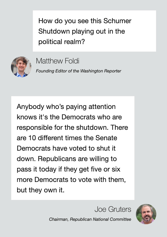 NOVEMBER OPEN?: Senator Eric Schmitt (R., Mo.) made some news at the Washington Reporter’s book party for his bestseller, The Last Line of Defense. Schmitt predicted the government would open on November 1st, citing the rollout of 2026 price notices for Affordable Care Act plans on the individual market.