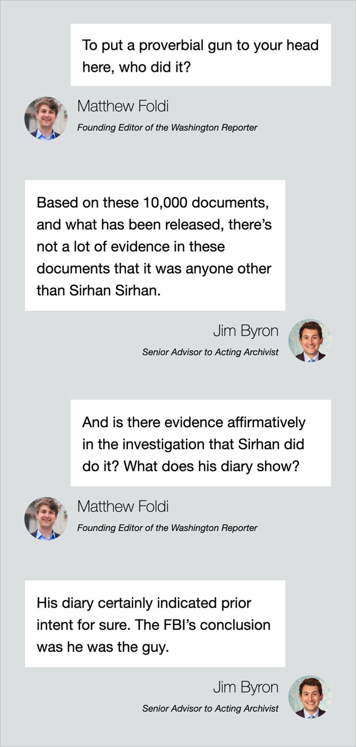 Byron wants Americans to visit archives.gov/rfk and read the 10,000 files that Director of National Intelligence (DNI) Tulsi Gabbard declassified last week. When asked about how Americans should approach the documents, Byron said that the conventional wisdom — that Sirhan Sirhan, a Palestinian furious about RFK’s support for Israel, acted alone and murdered RFK — holds up, for now.