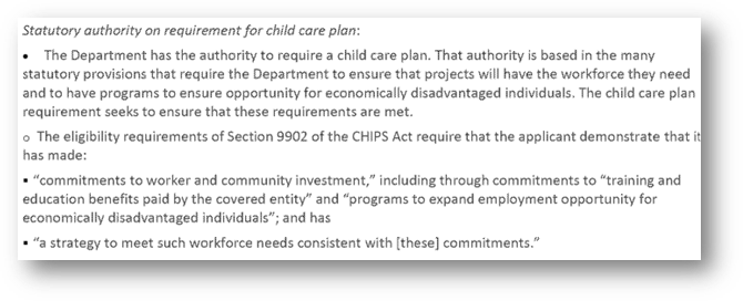 For example, the CHIPS Act didn’t mandate child care or profit-sharing. But it did give the Department of Commerce broad authority to set “criteria” for federal support. A senior advisor to Raimondo argued the CHIPS Act’s vague reference to “workforce needs” justified requiring child care plans.