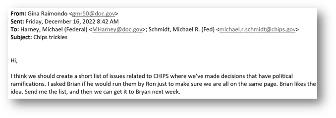 Raimondo knew they exceeded the statute’s bounds, which is why she preemptively asked her staff to come up with “a short list of issues related to CHIPS where we’ve made decisions that have political ramifications” (emphasis added).