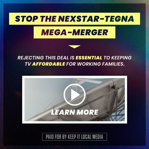 The FCC is considering a merger between TV station giants Nexstar and Tegna. If approved, millions of Americans will pay even more to watch TV. Rejecting this deal is essential to keeping TV affordable for working families and President Trump can help.