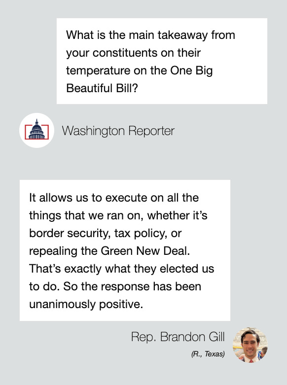 The Washington Reporter rode along with Rep. Brandon Gill (R., Texas) in his Texas town hall blitz through his district. At each stop, Gill gave an update on his work in Congress, the One Big Beautiful Bill (OBBB), and took questions from constituents.