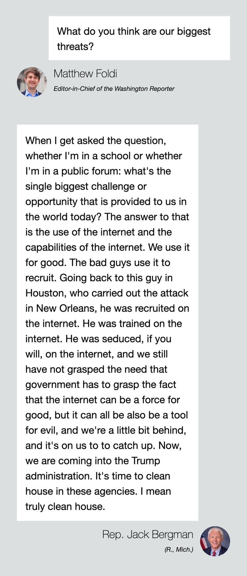 After the recent Islamic terror attack on New Years Day, during which a veteran plowed a truck into a New Orleans crowd, murdering 15 innocent bystanders, Bergman said that the internet is the “the single biggest challenge or opportunity that is provided to us.” He added that “we use it for good. The bad guys use it to recruit. [The New Orleans suspect] was recruited on the internet. He was trained on the internet. He was seduced, if you will, on the internet, and we still have not grasped the need that government has to grasp the fact that the internet can be a force for good, but it can all be also be a tool for evil, and we're a little bit behind, and it's on us to to catch up.”
