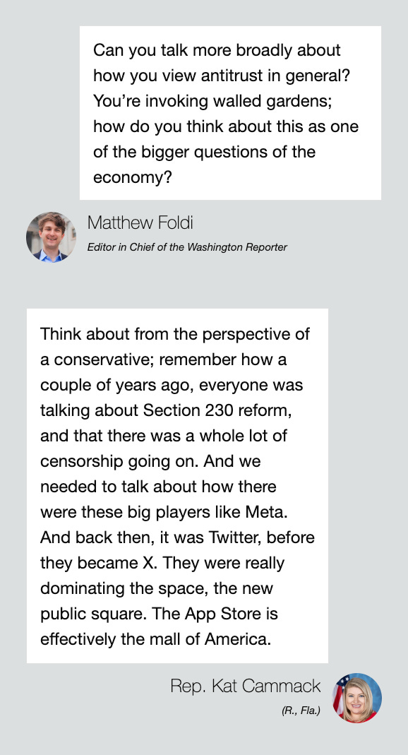 Cammack, a new mother, spoke with the Washington Reporter about her App Store Freedom Act, which she bills as legislation needed to tackle a “monopoly” between Apple and Google, whose App Store and Google Play store control app access for most Americans.