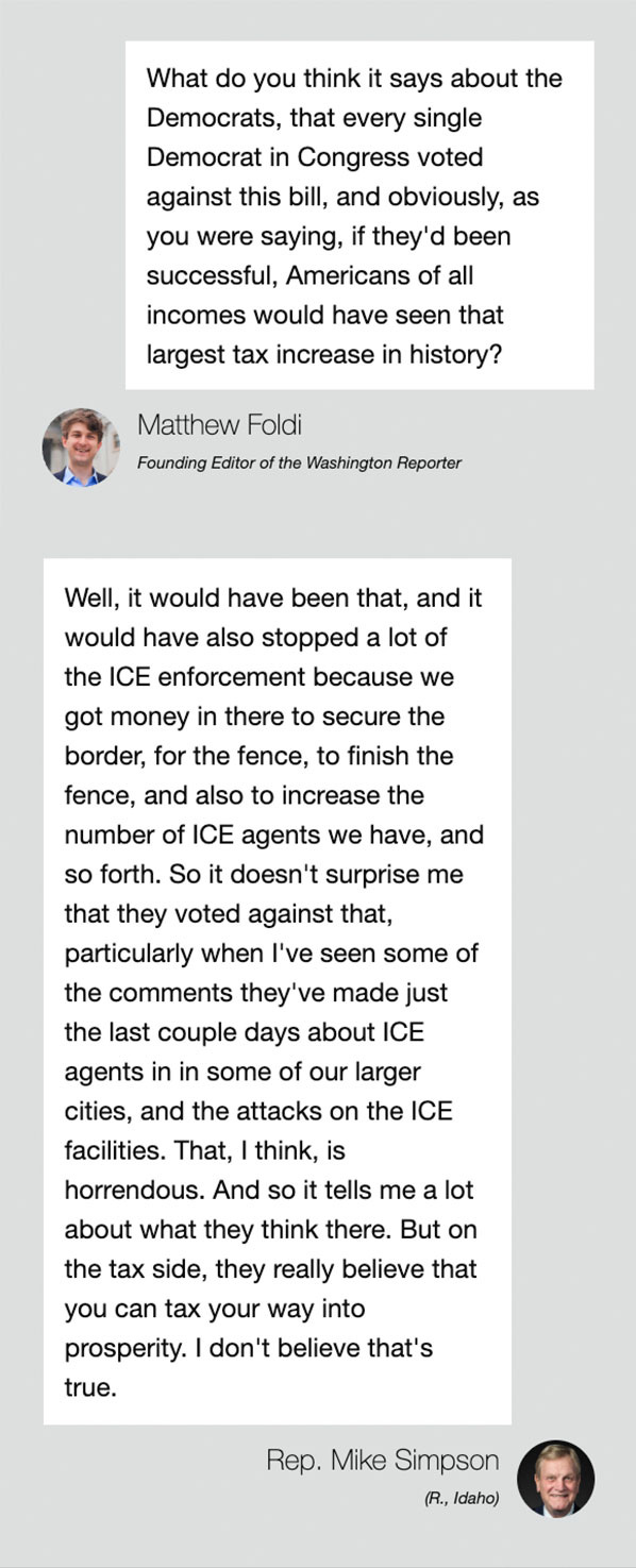 The OBBB also contained critical border security provisions that Simpson said that Idahoans and Americans in general want. The Democrats who opposed the bill, Simpson said, voted to “stop a lot of the ICE enforcement because we got money in there to secure the border, for the fence, to finish the fence, and also to increase the number of ICE agents we have, and so forth,” while also siding against the popular tax provisions.