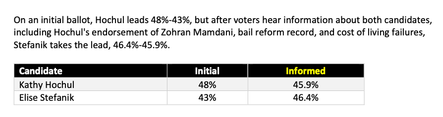 The poll, which was paid for and commissioned by Stefanik’s E-PAC, showed Stefanik leading Hochul, 46.4 percent to 45.9 percent after voters are informed about both candidates. Hochul’s “endorsement of Zohran Mamdani, bail reform record, and cost of living failures” all help propel Stefanik into a lead in the heavily-anticipated showdown that would take place next year.