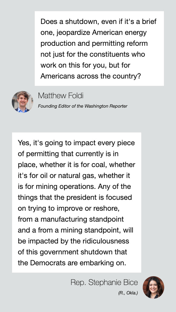Bice, a member of the House Appropriations Committee, has spent months working alongside her fellow Oklahoman, Rep. Tom Cole — the committee’s chair — to get appropriations bills across the finish line. “And now the Democrats have decided that they want to hold the American people hostage, demanding $1.5 trillion in additional spending to keep government open,” she said. “It’s just remarkable.”