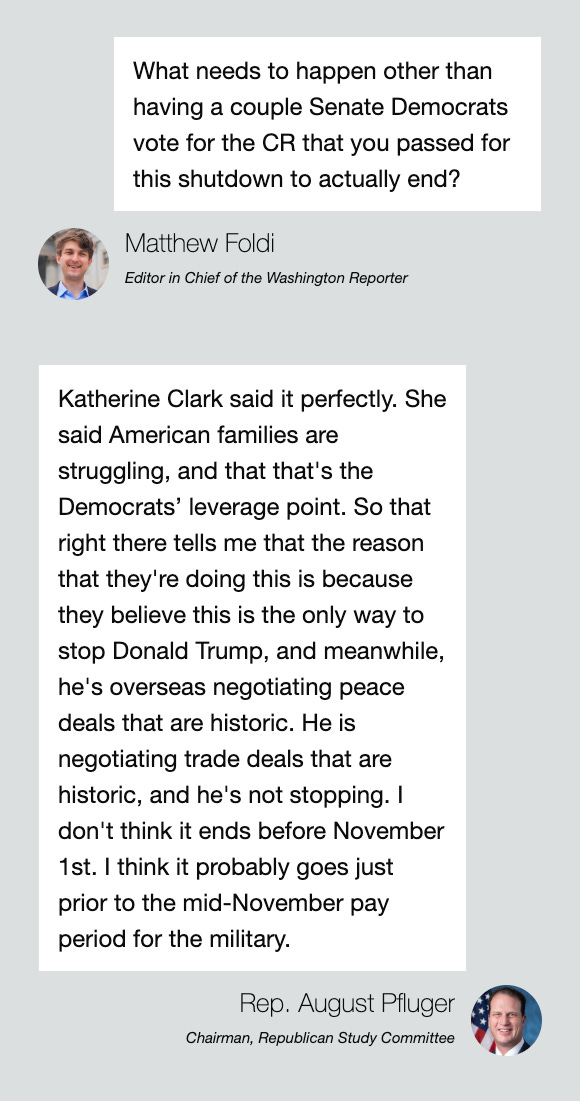 Throughout the Schumer Shutdown, Pfluger and his caucus members have been everywhere; most recently, they jointly hosted a press conference with House GOP leadership and welcomed Speaker Mike Johnson (R., La.) and Majority Leader Steve Scalise (R., La.) on the Right to the Point Podcast, both of which were covered by the Washington Reporter.