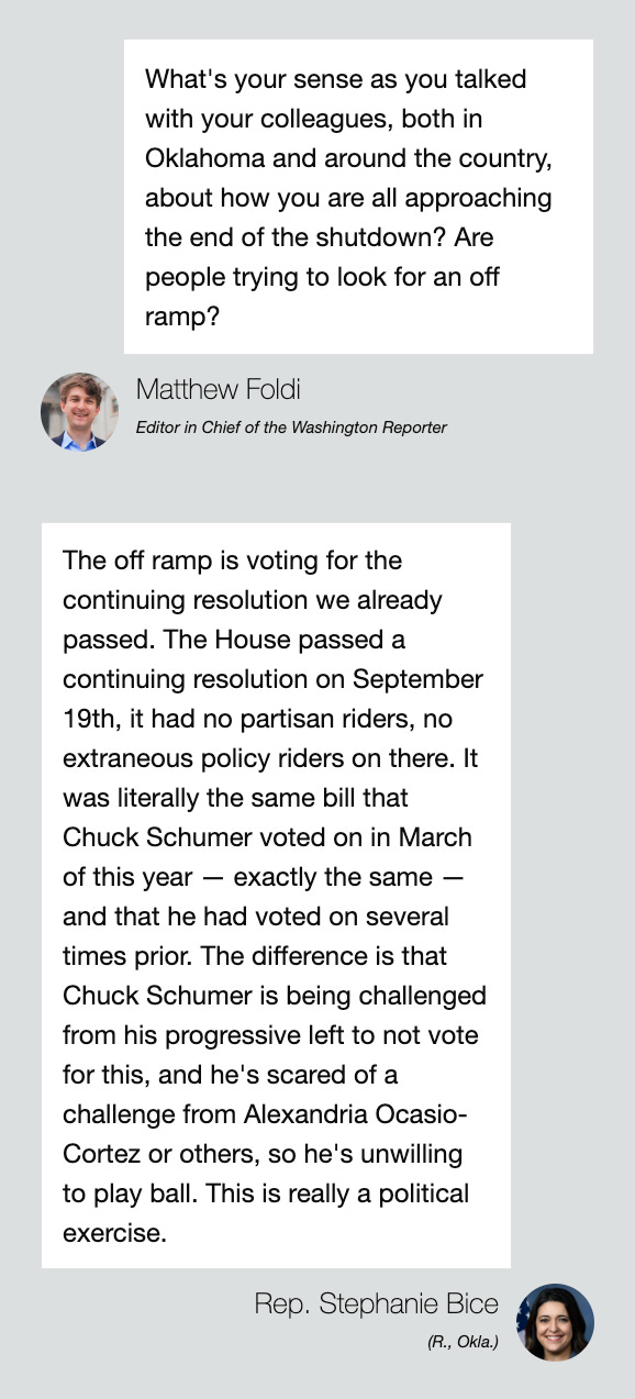 Rep. Stephanie Bice (R., Okla.) painted a bleak picture of the GOP’s attempts to negotiate in the legislative branch, while the executive branch continues its work apace. “It’s easier to negotiate with Hamas evidently than it is to negotiate with Democrats right now,” she told the Washington Reporter in an interview.
