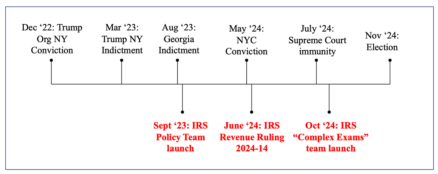 The IRS announced the team that would lead policy work on the Revenue Ruling on September 2023 — just a few weeks after Trump’s Fulton County mugshot was released. The actual Revenue Ruling was released in June 2024 — just weeks after Trump was convicted by a New York City jury. The IRS announced another team to focus on “complex exams” — which could include the Trump Organization — in October 2024, right before the presidential election, and shortly after the Supreme Court ruled in favor of Trump’s immunity from many criminal charges, although not from the type of civil liability for the Trump Organization that the IRS could target.
