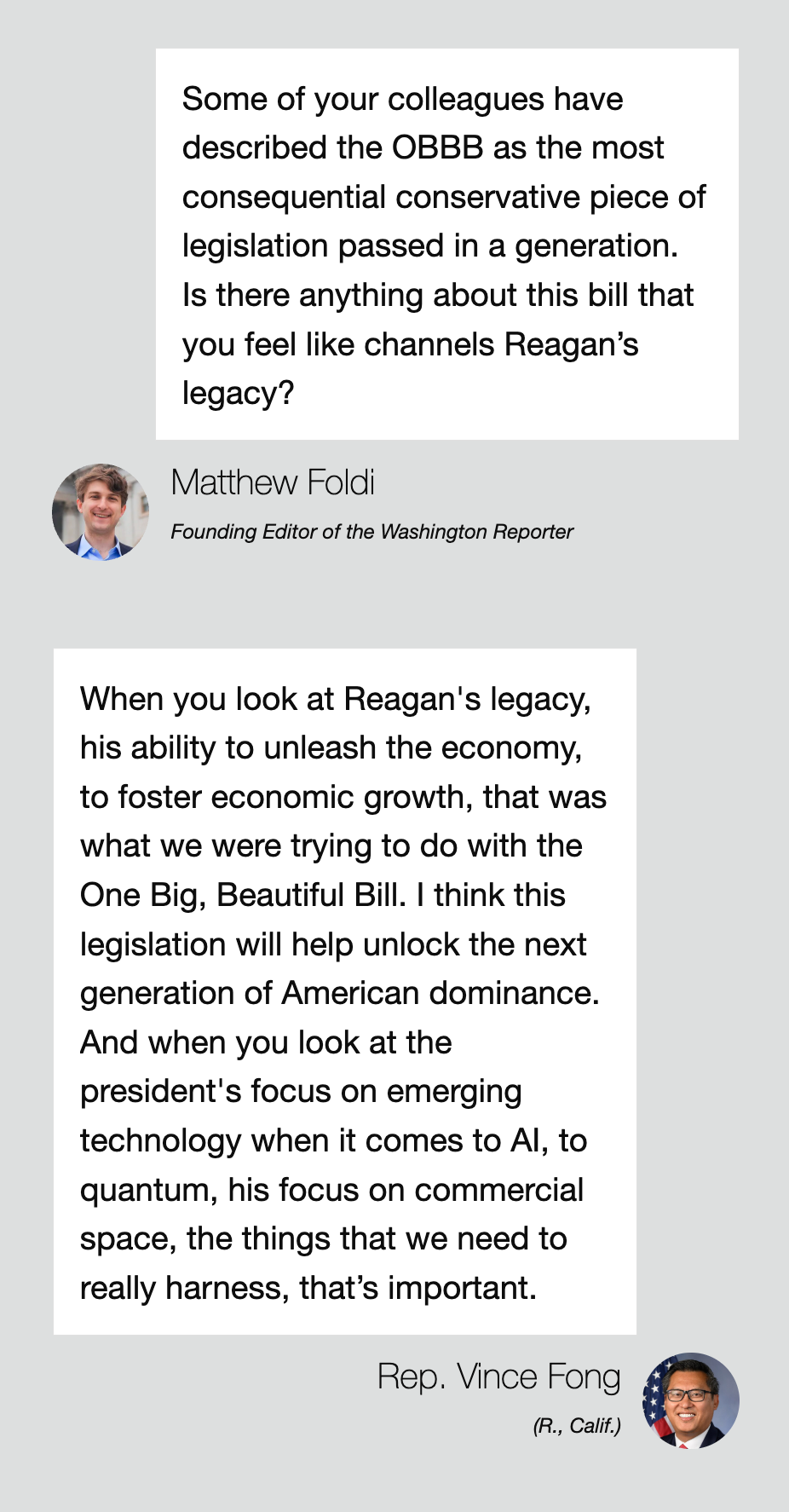 “When you look at Reagan's legacy — his ability to unleash the economy, to foster economic growth — that was what we were trying to do with the One Big, Beautiful Bill,” Fong said. “This legislation will help unlock the next generation of American dominance. And when you look at the president's focus on emerging technology when it comes to AI, to quantum, his focus on commercial space, the things that we need to really harness, that’s important. A lot of it's going to be focused on can we get investment in America? Can we deregulate and attract these new businesses away from China and back to America? All of that is done, the framework and the foundation of it is in the One Big, Beautiful Bill.”