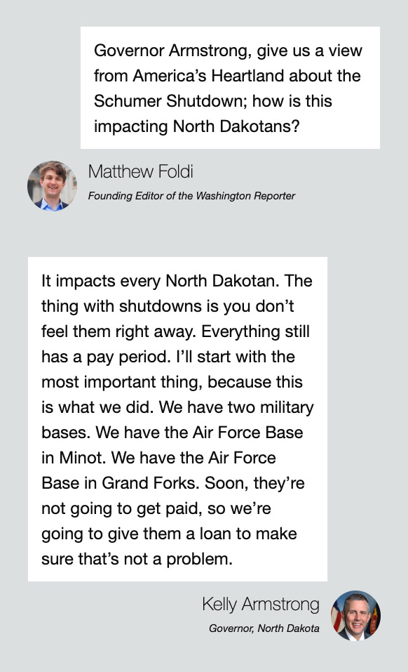 And while America’s heartland isn’t on the radar of Sen. Chuck Schumer (D., N.Y.) or Rep. Hakeem Jeffries (D., N.Y.), Armstrong explained that their shutdown “impacts every North Dakotan.”
