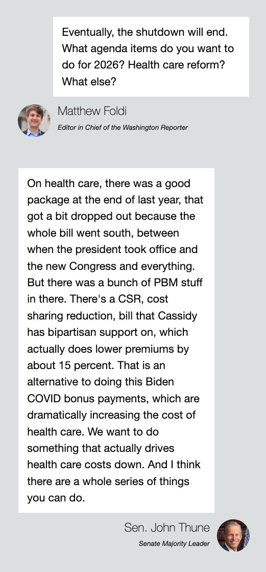 “I would be very surprised in the end, when the government opens up, if he’s one of the votes to open it,” Thune told the Reporter in his latest interview. “I think it’s going to come from rank and file Democrats.”