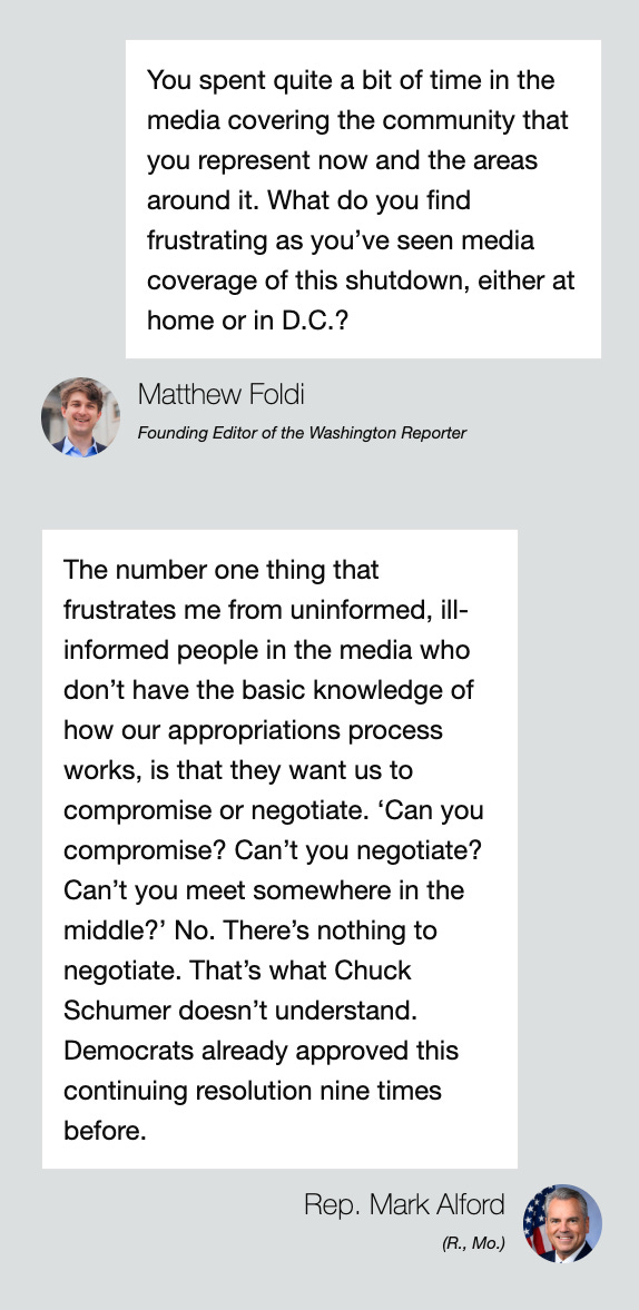 As the Schumer Shutdown careens towards its second month, Rep. Mark Alford (R., Mo.) has a simple message for Senate Democrats and their allies in the media who are hoping that House Republicans will cave.