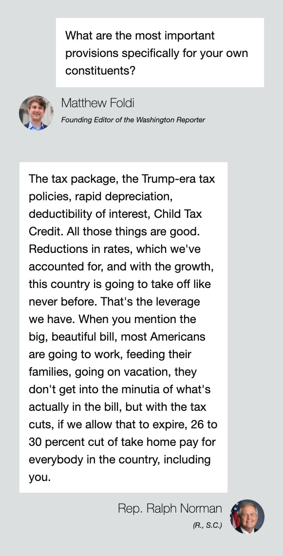 The stakes, Norman said, are incredibly high; “we’ve got one chance in a lifetime with reconciliation to make this happen.” The South Carolinian has communicated his position to both James Blair and to Karoline Leavitt, who made the case to House Republicans this week that Trump wants the bill on his desk ASAP. Norman would like to see Trump himself make more of a proactive case himself.
