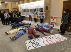 At a University of Iowa job fair, activists wearing COVID masks and doctors’ uniforms drenched in fake blood demanded that Collins Aerospace — one of the largest employers in Iowa — “end [its] complicity” with Israel.